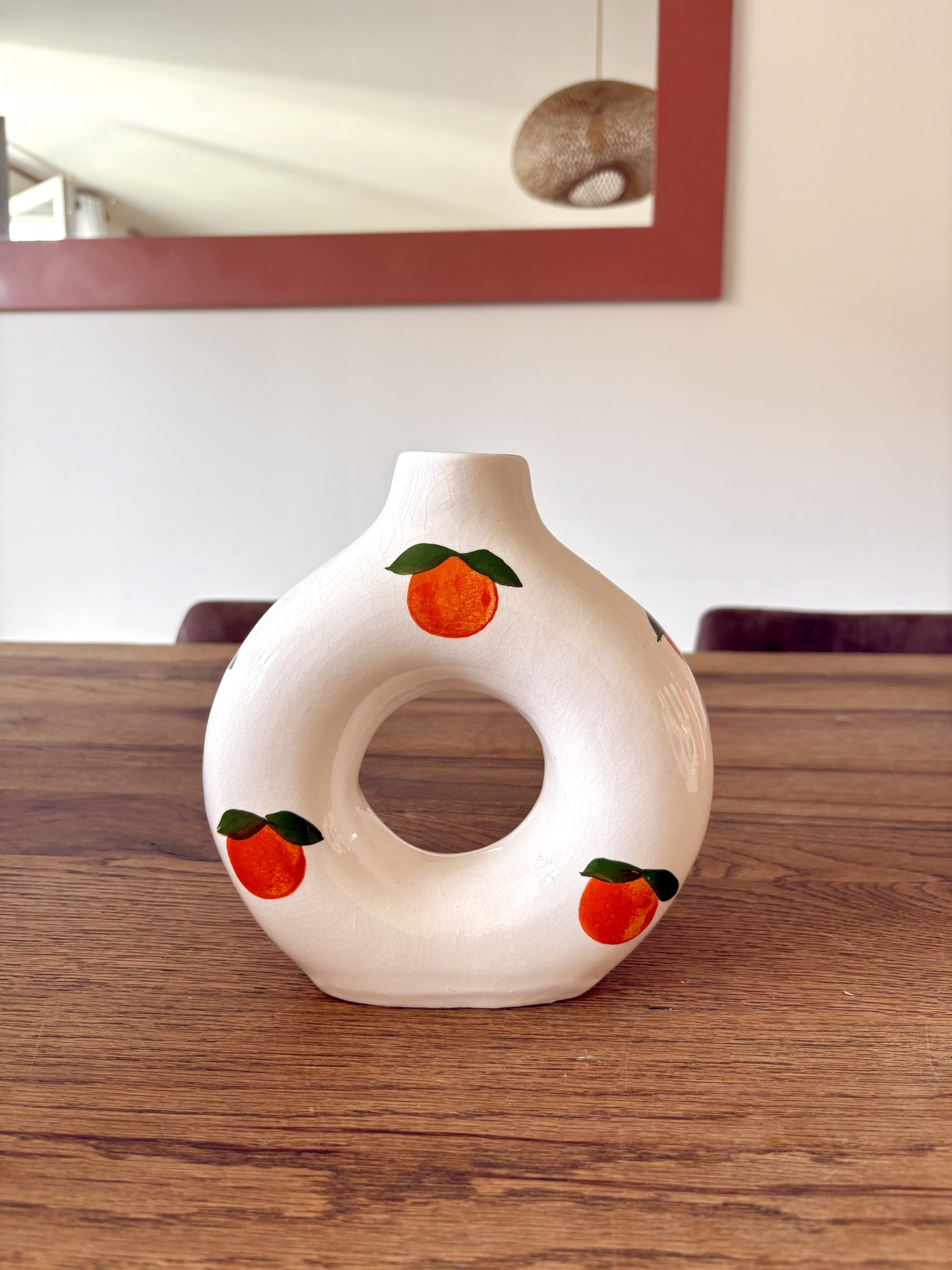 Ce vase blanc fait main incarne tout le charme de l’artisanat. Orné de jolis dessins d’oranges peints à la main, il apporte une touche fraîche, lumineuse et résolument tendance à votre intérieur. Parfait pour sublimer une étagère ou une table estivale.